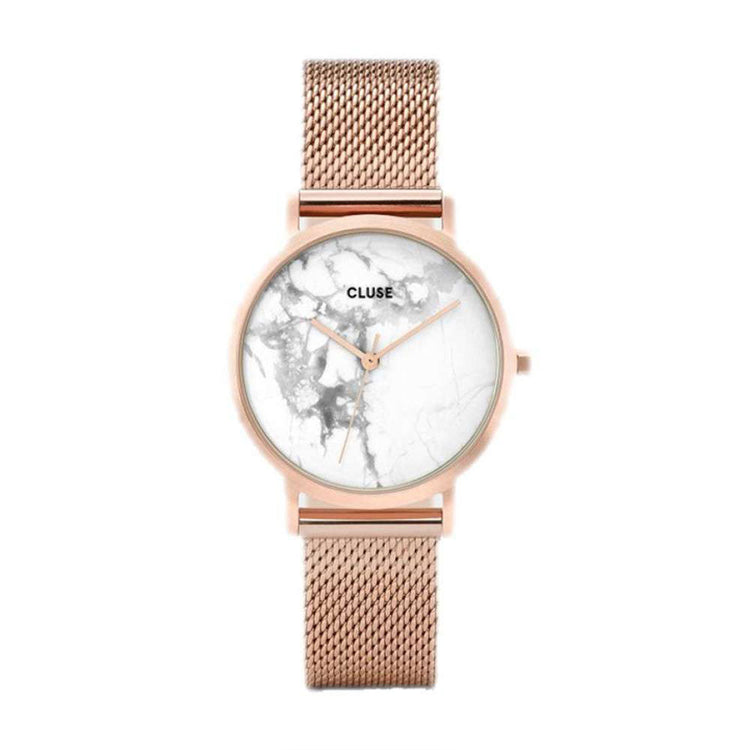 Ένα κομψό και με αρκετά μοντέρνο χαρακτήρα γυναικείο ρολόι της εταιρίας CLUSE . Συνδυάζει αρμονικά το λευκό του καντράν με το πρωτότυπο σχέδιο από μάρμαρο. Διαθέτει ροζ-χρυσό μπρασελέ με ψαροκόκκαλο και κούμπωμα ασφαλείας.