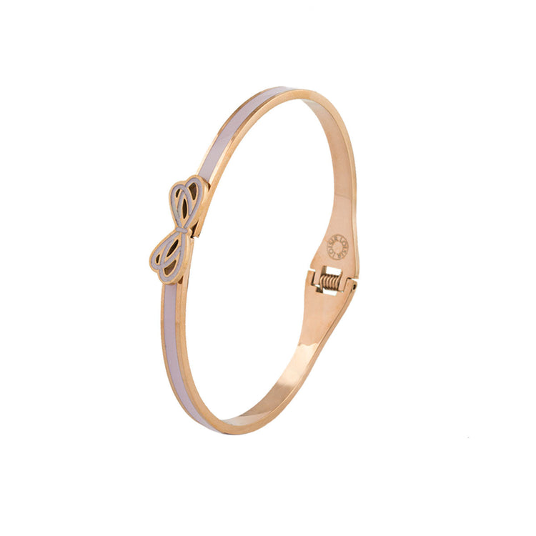 Η επιφάνεια του κοσμήματος είναι γυαλιστερή και στο κέντρο της χειροπέδας υπάρχει ένα χαρακτηριστικό φιογκάκι από ροζ σμάλτο.