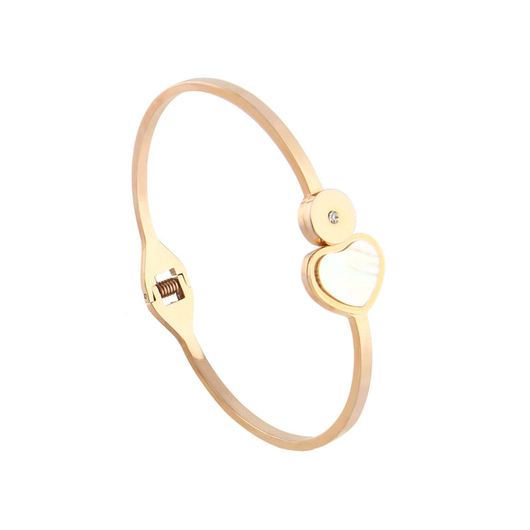 Η επιφάνεια του κοσμήματος είναι γυαλιστερή και στο κέντρο της χειροπέδας υπάρχει μια καρδιά από φίλντισι. Πλαισιώνεται από ένα στρογγυλό στοιχείο με τοποθετημένο ένα λευκό κρύσταλλο στο κέντρο του.