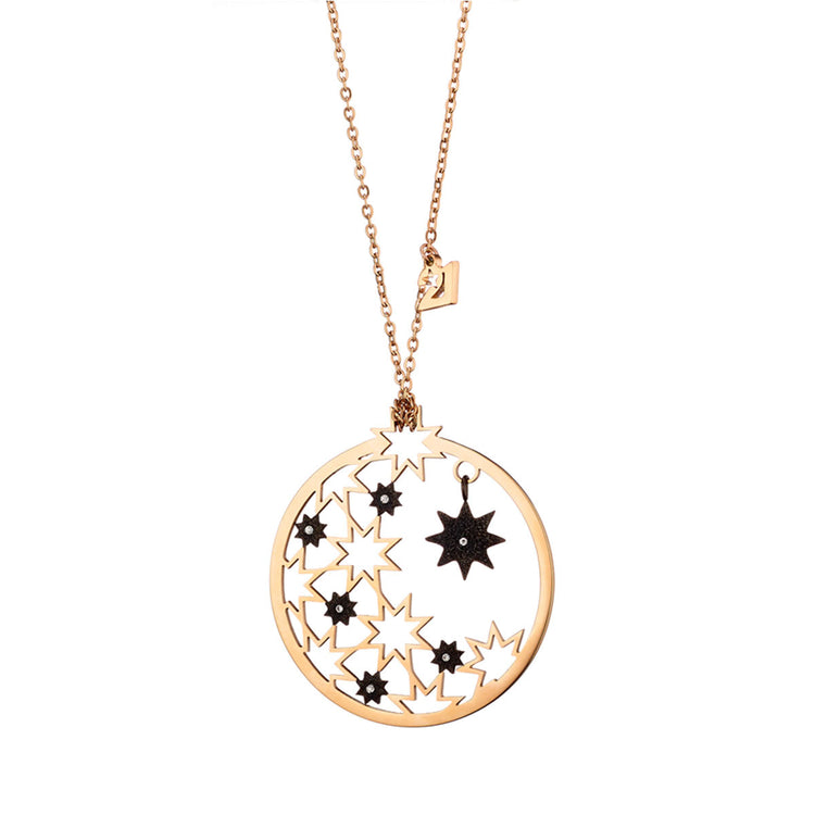 Ένα φοβερό μακρύ γυναικείο κολιέ με λεπτή αλυσίδα σε ροζ χρυσή επιμετάλλωση. Το κόσμημα αποτελείται από ένα στρογγυλό στοιχείο με διάτρητο σχεδιασμό και αστεράκια με μαύρα και λευκά κρύσταλλα με λαμπερή σαγρέ επιφάνεια.