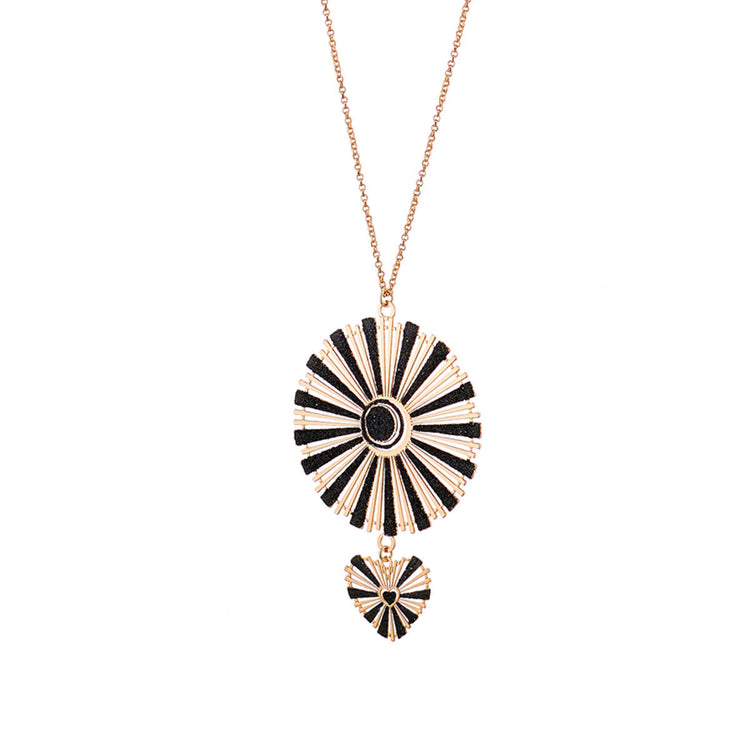 Ένα μοντέρνο γυναικείο κολιέ με αλυσίδα από ατσάλι με ροζ χρυσή επιμετάλλωση. Στο κέντρο της διαθέτει ένα διάτρητο στοιχείο σε σχήμα στρογυλλό με μαύρο glitter και στη συνέχεια ένα μικρότερου μεγέθους διάτρητο στοιχείο σε σχήμα καρδιάς με glitter επίσης!