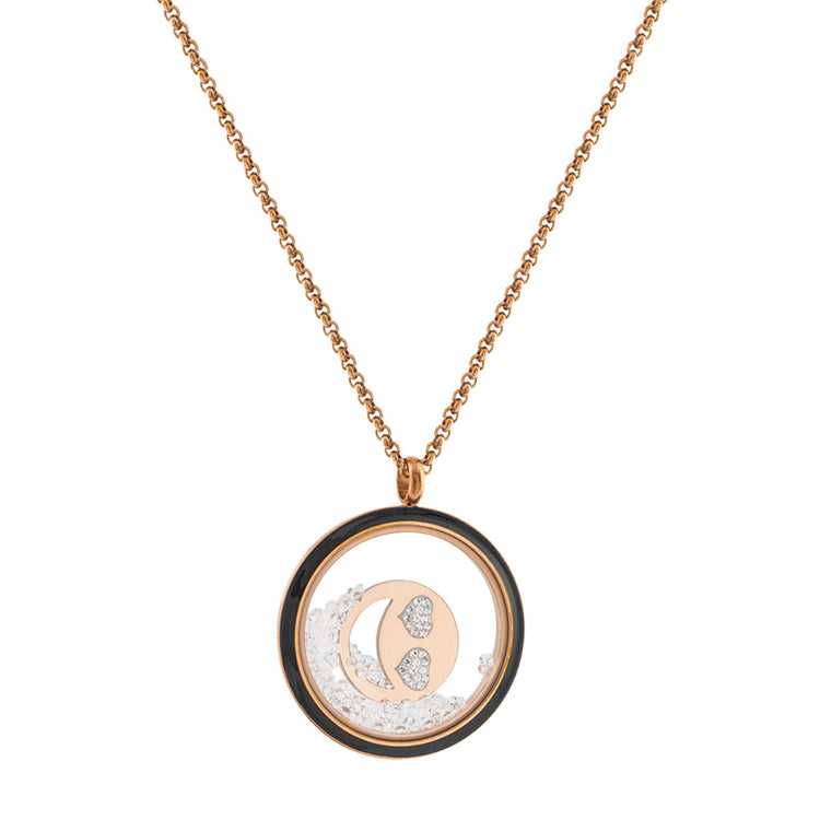Ένα υπέροχο γυναικείο κολιέ με λεπτή αλυσίδα από ροζ χρυσή επιμετάλλωση. Το κόσμημα αποτελείται από ένα στρογγυλό στοιχείο με μαύρο σμάλτο, όπου στο εσωτερικό του έιναι ένα emoji  με χαμόγελο και καρδούλες στα μάτια σχηματισμένες από λευκά κρύσταλλα. Επίσης, έχει κινούμενους λευκούς κρυστάλλους που κάνουν πιο χαριτωμένο το κόσμημα.