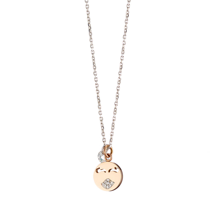 Ένα πανέμορφο γυναικείο κολιέ κατασκευασμένο από  ατσάλι. Το κόσμημα αποτελείται από ροζ χρυσό emoji με φιλάκι που είναι σχηματισμένο με λευκούς κρυστάλλους. Δίπλα της είναι μια λευκή λουστρέ ντισκομπάλα. Το κολιέ αυτό δημιουργεί μια playful διάθεση.