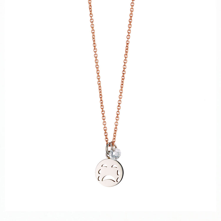 Ένα χαριτωμένο γυναικείο κολιέ με λεπτή αλυσίδα με ροζ χρυσή επίστρωση. Αποτελείται από ένα emoji που κλαίει και πλαισιώνεται απο μία ντισκομπάλα με λευκά κρύσταλλα.