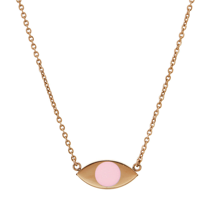 Ένα υπέροχο γυναικείο κολιέ με αλυσίδα από ατσάλι με ροζ χρυσή επιμετάλλωση. Αποτελείται από ένα στοιχείο σε σχήμα ματιού με ροζ σμάλτο. Ένα κολιέ που θα λατρέψετε!