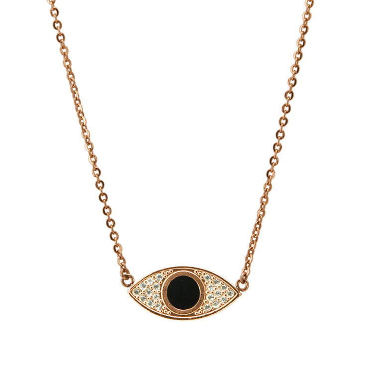 Ένα φανταστικό γυναικείο κολιέ με αλυσίδα από ατσάλι με ροζ χρυσή επιμετάλλωση. Αποτελείται από ένα στοιχείο σε σχήμα ματιού με μαύρο σμάλτο και διακοσμημένο με λευκά κρύσταλλα.