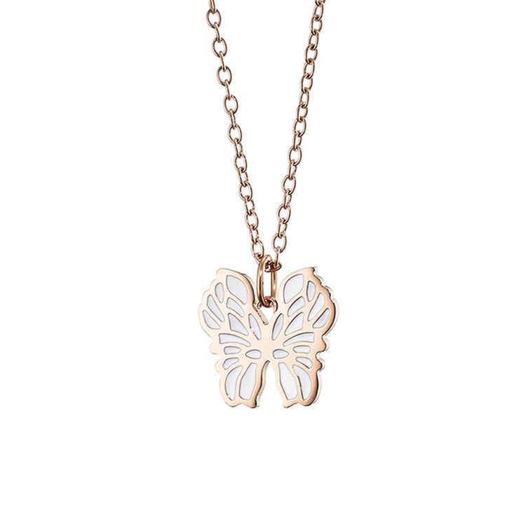 Ένα εξαιρετικό γυναικείο κολιέ με λεπτή αλυσίδα από ατσάλι με ροζ χρυσή επιμετάλλωση. Στο κέντρο της, είναι ένα εντυπωσιακό στοιχείο με ροζ χρυσή επιμετάλλωση περιμετρικά του σε σχήμα πεταλούδας, διακοσμημένο με λευκές λεπτομέρειες από σμάλτο.