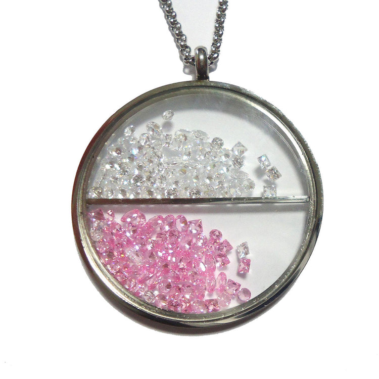 Ένα πανέμορφο γυναικείο κολιέ κατασκευασμένο από ατσάλι. Το κόσμημα αποτελείται από ροζ και λευκούς κρυστάλλους, χωρισμένους σε δύο αυτοτελή μέρη. Οι κρύσταλλοι είναι κινούμενοι και ανεβάζουν τη διαθεσή σας στα ύψη!
