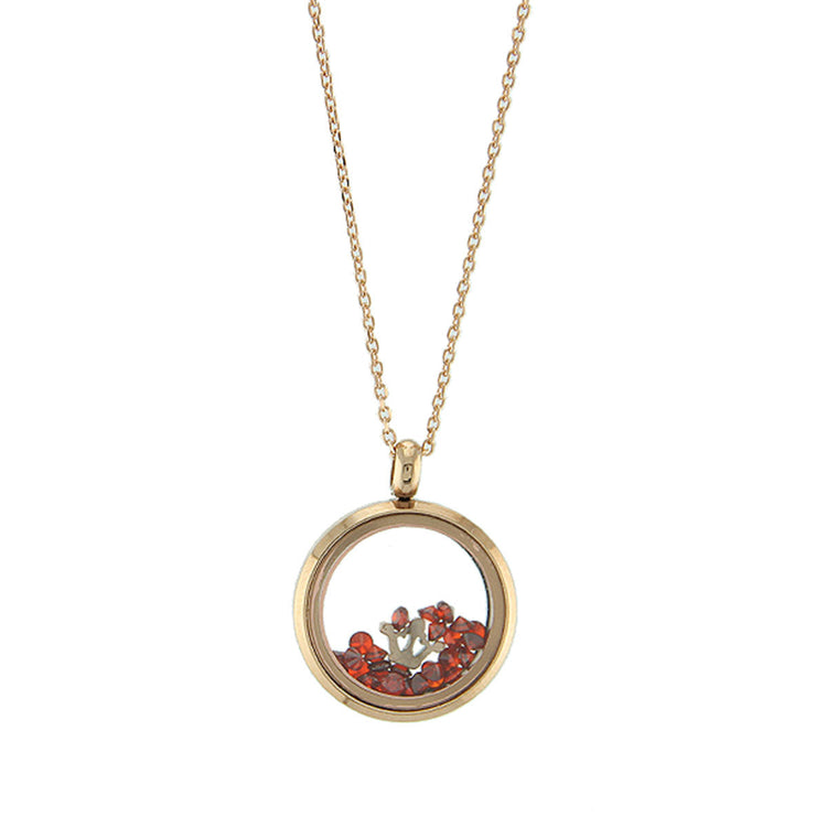 Ένα μοναδικό γυναικείο κολιέ με αλυσίδα από ατσάλι με ροζ χρυσή επιμετάλλωση. Αποτελείται από ένα ροζ χρυσό στοργγυλό στοιχείο με κινούμενα κόκκινα ζιργκόν που συμβολίζουν το μήνα Ιανουάριο και ροζ χρυσό στέμμα.