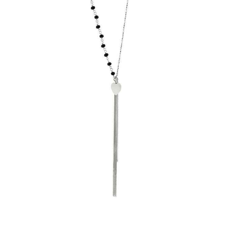Ένα πανέμορφο γυναικείο κολιέ κατασκευασμένο από ατσάλι. Το κόσμημα αποτελείται από τη μία πλευρά της αλυσίδας με ροζάριο. Στο κέντρο της είναι μια καρδούλα και μια φανταστική φούντα από αλυσίδες. Ένα μοναδικό κόσμημα που θα λατρέψετε!