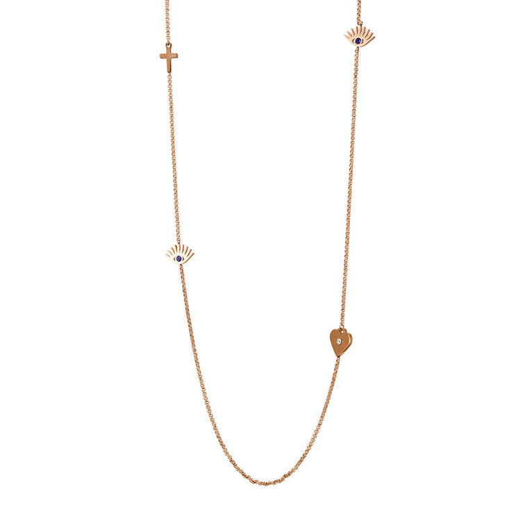 Ένα ξεχωριστό μακρύ κολιέ που θα εκτιμήσετε από την πρώτη στιγμή. Με εντυπωσιακά σχέδια ματιού, καρδιάς και σταυρού να κοσμούν την επιφάνεια της αλυσίδας, είναι δεδομένο πως θα αποτελέσει μία ιδιαίτερη επιλογή για το γυναικείο ντύσιμο.