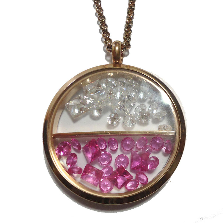 Ένα πανέμορφο γυναικείο κολιέ κατασκευασμένο από ατσάλι. Το κόσμημα αποτελείται από ένα στρογγυλό στοιχείο όπου στο εσωτερικό του έχει φούξια και λευκούς κρυστάλλους, χωρισμένους σε δύο αυτοτελή μέρη. Οι κρύσταλλοι είναι κινούμενοι και ανεβάζουν τη διαθεσή σας στα ύψη!