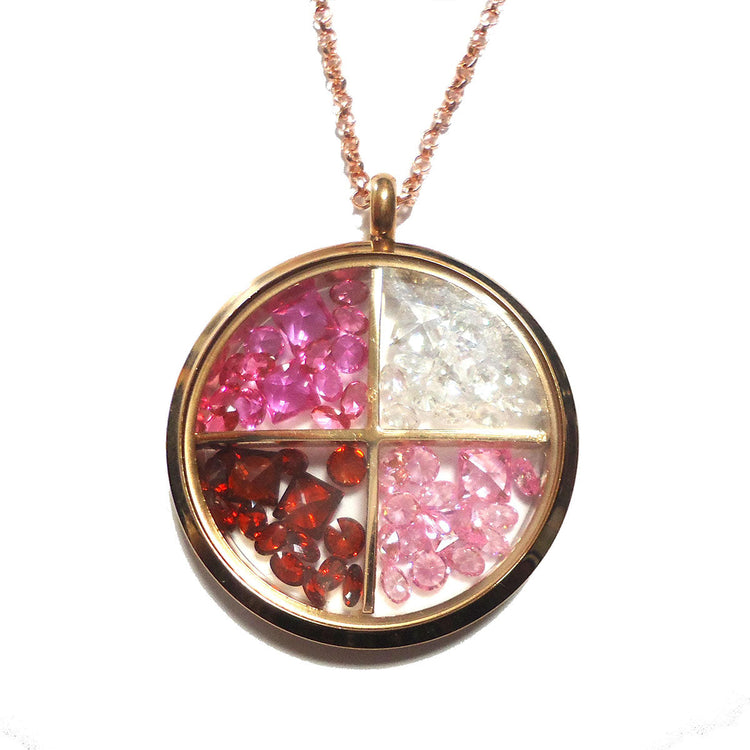 Ένα ξεχωριστό γυναικείο κολιέ κατασκευασμένο από ατσάλι με ροζ χρυσή επιμετάλλωση. Το κόσμημα αποτελείται από ένα στρογγυλό στοιχείο όπου στο εσωτερικό του έχει φούξια, λευκούς, ροζ και κόκκινους κρυστάλλους, χωρισμένους σε τέσσερα αυτοτελή μέρη. Οι κρύσταλλοι είναι κινούμενοι και ανεβάζουν τη διαθεσή σας στα ύψη!