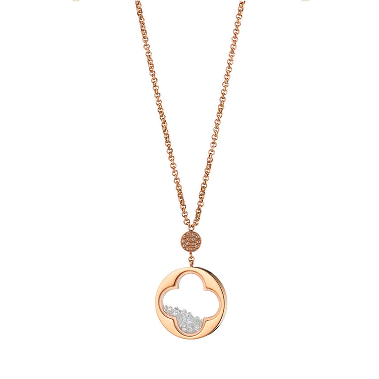 Ένα όμορφο γυναικείο κολιέ με λεπτή αλυσίδα σε ροζ χρυσή επιμετάλλωση. Το κόσμημα αποτελείται από ένα ένα στρογγυλό στοιχείο σε ροζ χρυσή επιμετάλλωση με τοποθετημένα λευκά κρύσταλλα πάνω του. Από το στοιχείο αυτό κρέμεται ένα ακόμη στρογγυλό στοιχείο με μορφή λουλουδιού με κινούμενους λευκούς κρυστάλλους στο εσωτερικό του.