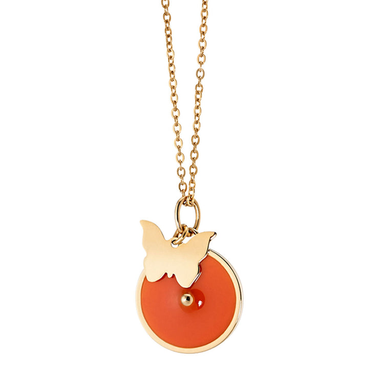 Ένα εξαιρετικό γυναικείο κολιέ με αλυσίδα από ατσάλι με χρυσή επιμετάλλωση. Στο κέντρο της, είναι ένα στρογγυλό στοιχείο με χρυσή επιμετάλλωση περιμετρικά του και το εσωτερικό του είναι κατασκευασμένο από πορτοκαλί σμάλτο με μια διακριτική χρυσή τρυπούλα. Επίσης, πλαισιώνεται από μια χρυσή πεταλουδίτσα.