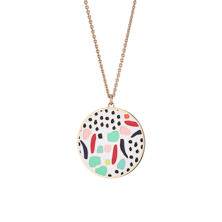 Ένα φανταστικό μακρύ γυναικείο κολιέ με λεπτή αλυσίδα από ατσάλι με ροζ χρυσή επιμετάλλωση. Διακοσμείται από ένα μεγάλου μεγέθους στρογγυλό στοιχείο με όμορφα σχέδια κατασκευασμένα από πολύχρωμο σμάλτο.