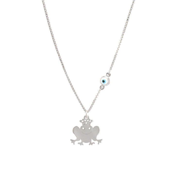 Ένα πανέμορφο γυναικείο κολιέ σχεδιασμένο από ασήμι 925. Το κόσμημα αποτελείται από ένα βατραχάκι με κορώνα στο κεφάλι και ένα ματάκι στο πλάι του.