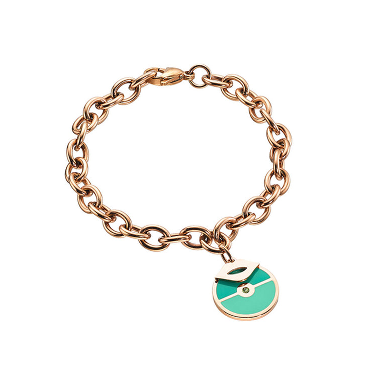 Ένα εκλεπτυσμένο γυναικείο βραχιόλι με χοντρή αλυσίδα φτιαγμένη από ατσάλι σε ροζ επιμετάλλωση.