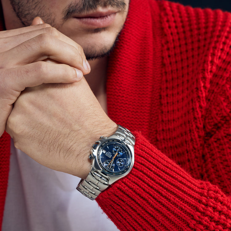 Ένα εξαιρετικό ανδρικό μοντέλο, με κομψό σχεδιασμό, μπλε καντράν, μπρασελέ δέσιμο και υπέροχες λεπτομέρειες στους δείκτες και τα σημεία.