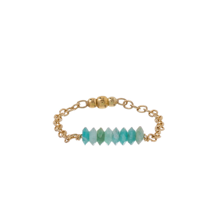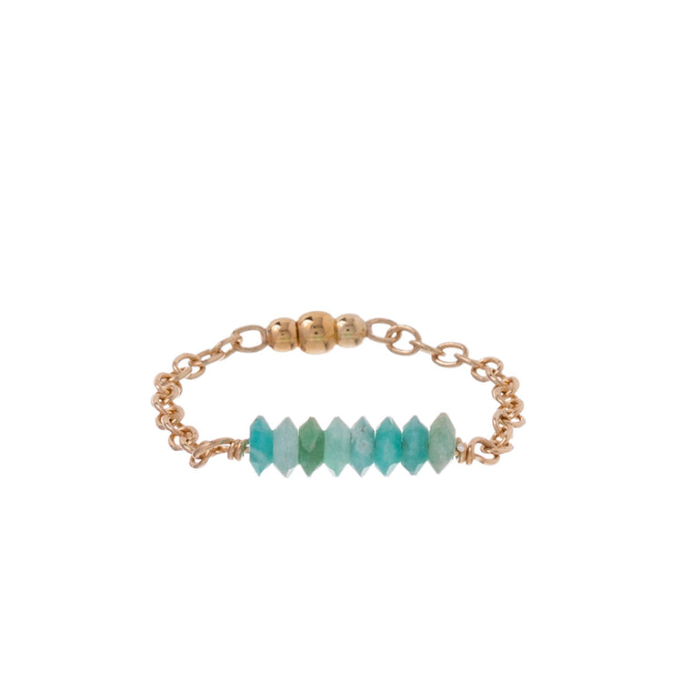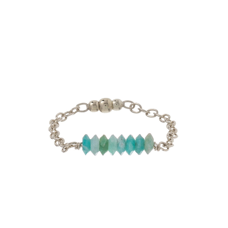 Ένα εντυπωσιακό δαχτυλίδι με αλυσίδα και γραμμή από πέτρες αμαζονίτη σε χρώμα τυρκουάζ-πράσινο στο κέντρο του, από την Alisia, κατασκευασμένο από ασήμι 925.