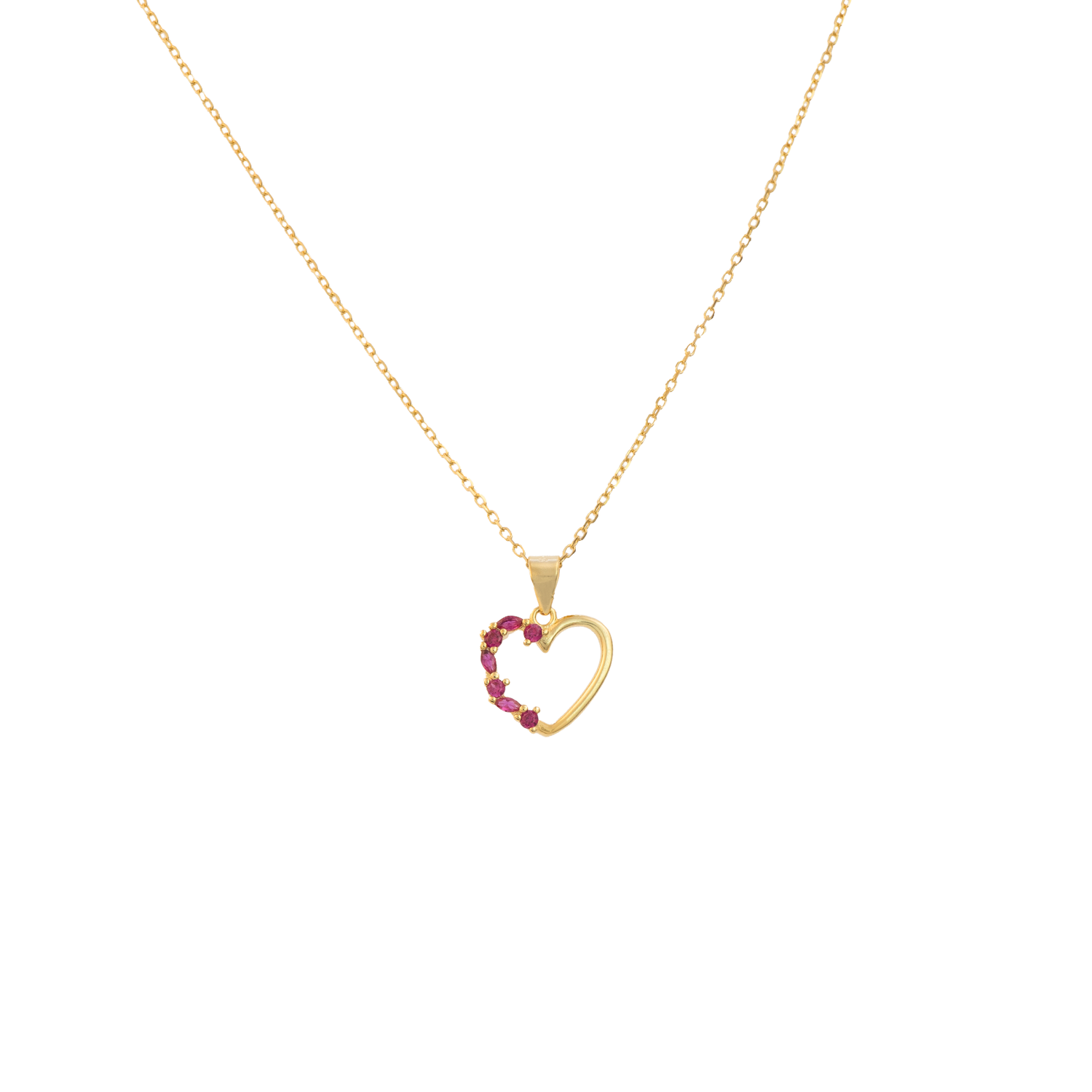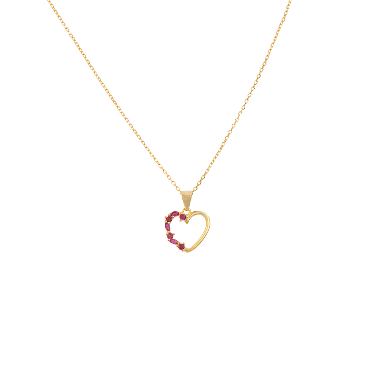 Αυτό το λεπτεπίλεπτο και σύγχρονο κολιέ διαθέτει ένα μίνιμαλ μοτίφ καρδιάς σε σχήμα περιγράμματος, διακοσμημένο με μια σειρά από αστραφτερές κόκκινες πέτρες ζιργκόν στη μία πλευρά.  Διαθέτει λουστρέ επιφάνεια.