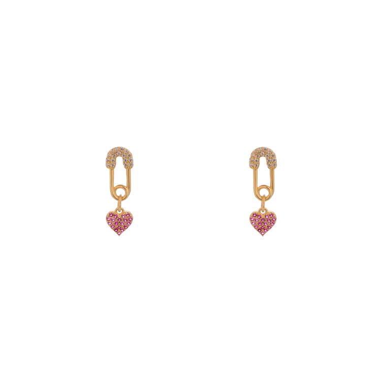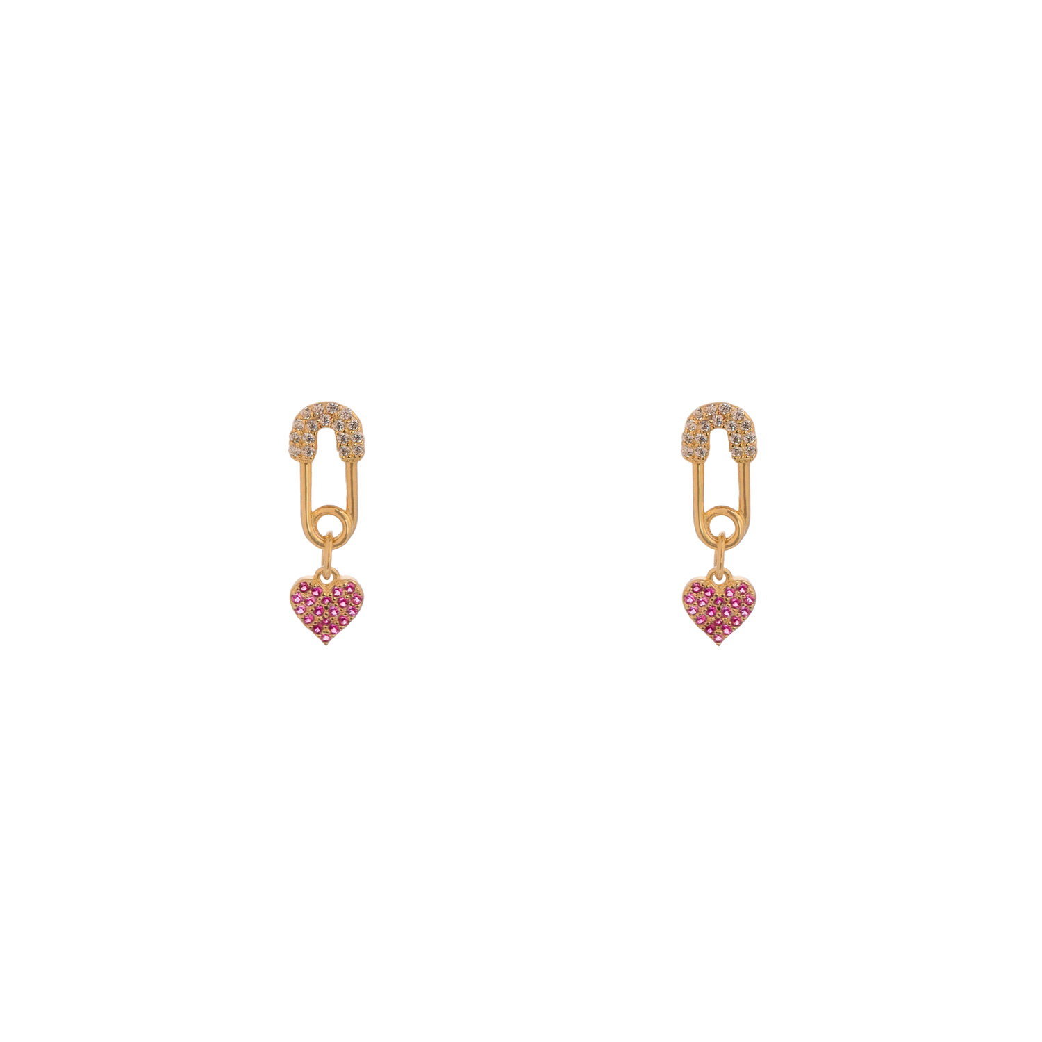 Αυτό το σετ επίχρυσα σκουλαρίκια διαθέτει ως κεντρικό στοιχείο ένα κρεμαστό μοτίφ καρδιάς διακοσμημένο από πέτρες ζιργκόν ροζ χρωματισμού. Διαθέτει ζιργκόν και στο καρφωτό μέρος του κοσμήματος προσδίδοντας αξεπέραστη λάμψη. Το φινίρισμα του είναι λουστρέ.