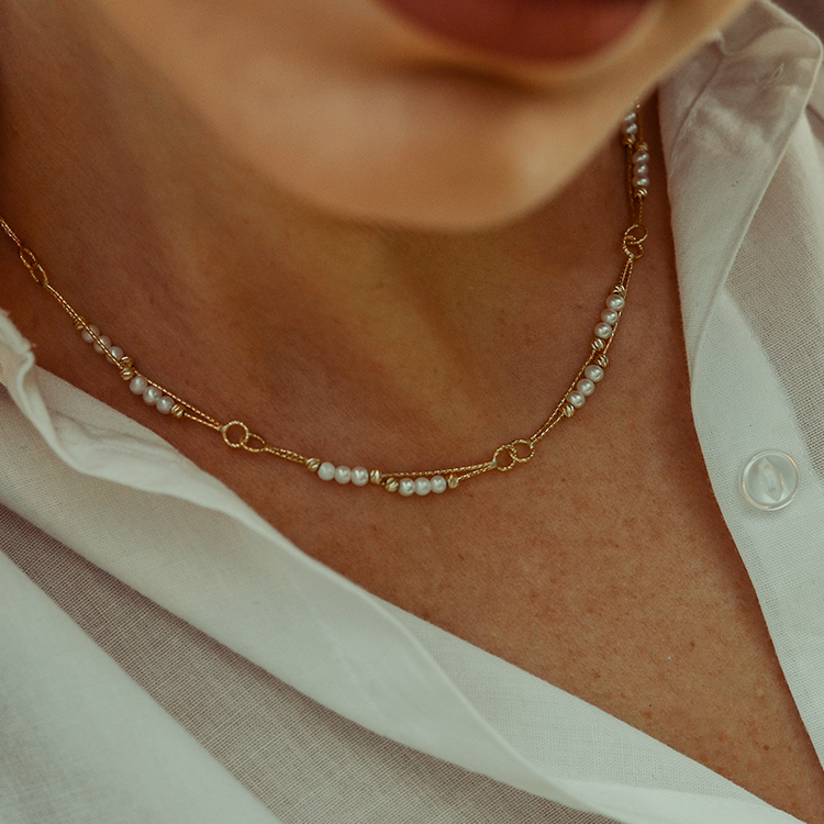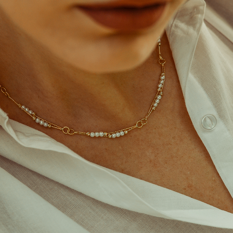 Η επιφάνειά του είναι λουστρέ και διαθέτει αλυσίδα με φανταστική πλέξηΔιπλό κολίε με ενωμένους κρίκους και μαργαριτάρια πλαισιωμένα με διαμανταρισμένες μπίλιες.