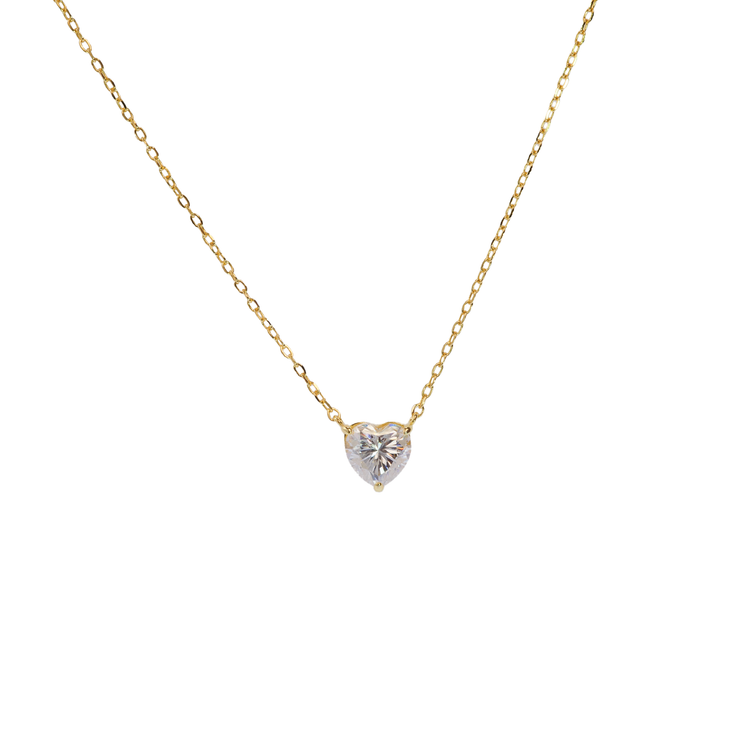 Αυτό το λεπτό και διακριτικό κολιέ διαθέτει ως κεντρικό στοιχείο ένα κρεμαστό επίχρυσο μοτίφ σε σχήμα καρδιάς διακοσμημένο από τεχνητό διαμάντι (μοϊσανίτης), γνωστό για την εξαιρετική του λάμψη και ανθεκτικότητα.
