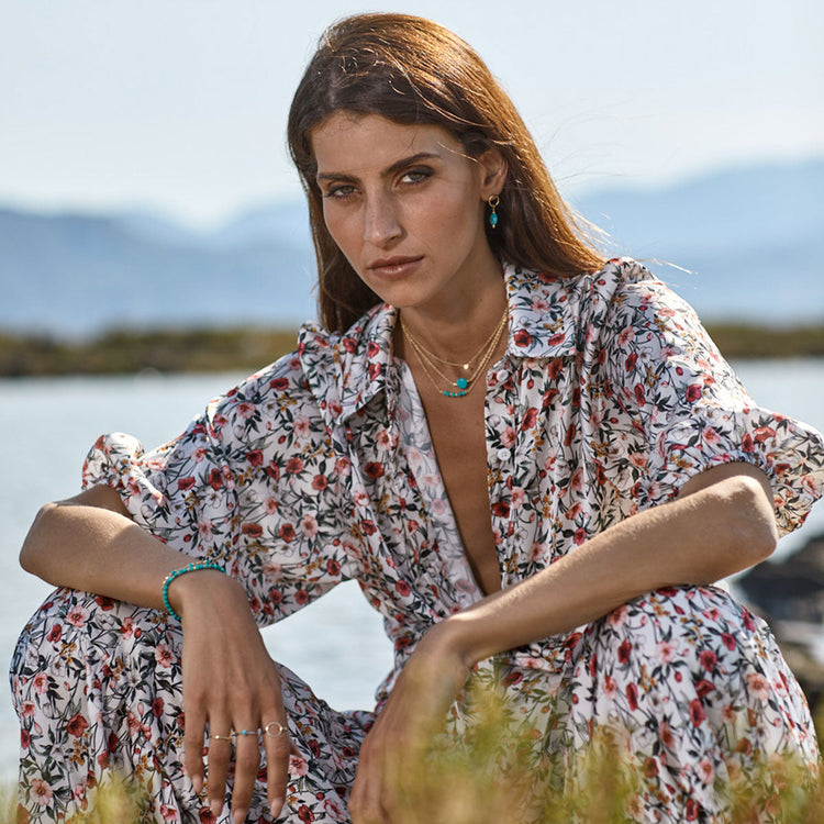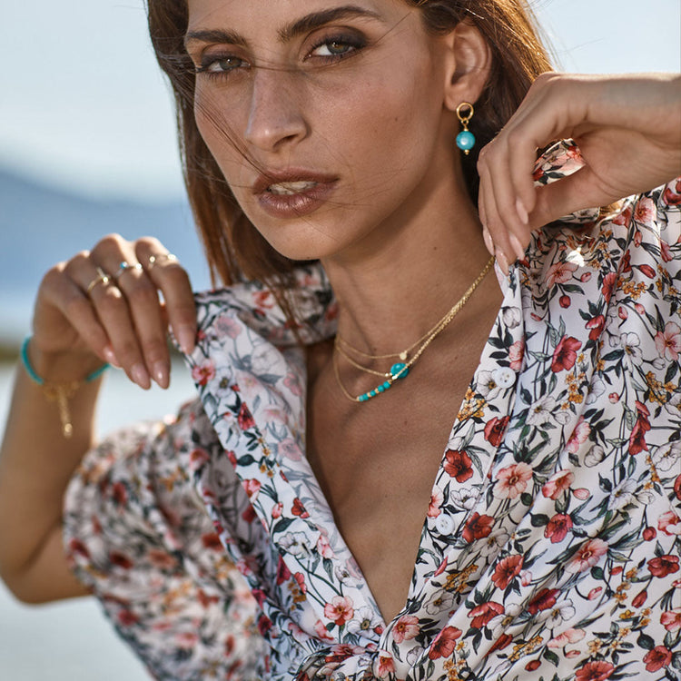 Ένα λαμπερό γυναικείο κολιέ Alisia με τιρκουάζ πέτρα στο κέντρο του και μικρά λουλούδια, κατασκευασμένο από ασήμι 925.