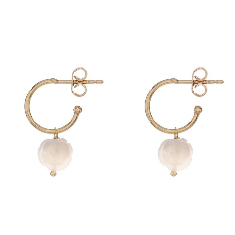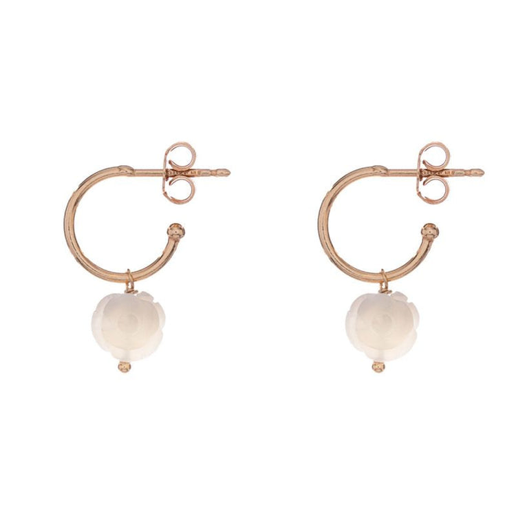 Ένα εξαιρετικό σετ σκουλαρίκια ημικύκλιο με κρεμαστό μενταγιόν από μαργαριτάρι (mother of pearl) σε σχήμα τριαντάφυλλου, από την Alisia, κατασκευασμένο από ασήμι 925.